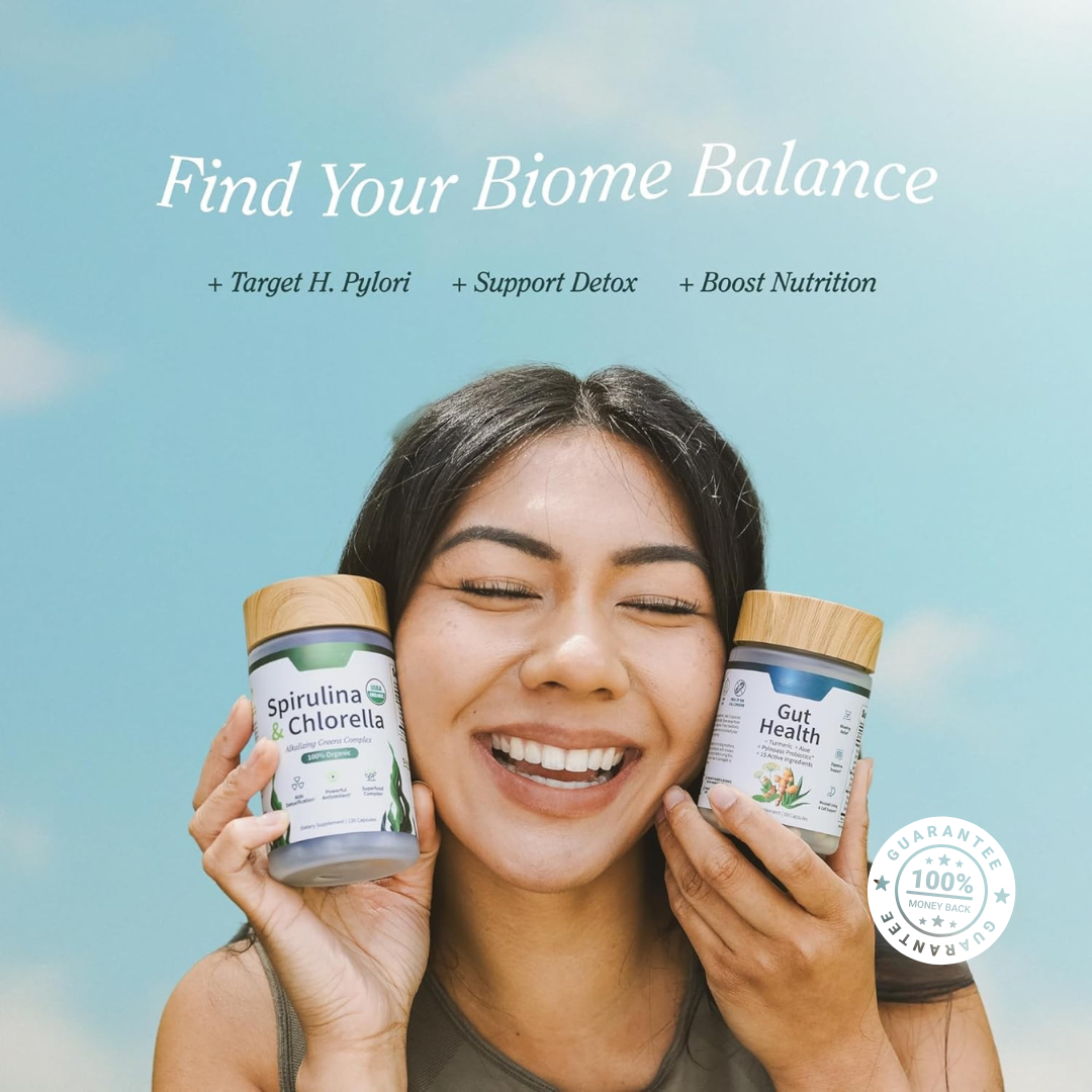 Imagine waking up with a flat stomach knowing you won't spend the day adjusting your clothes, avoiding social plans, or constantly worrying about bathroom access. No more looking 6 months pregnant by dinner. No more canceling plans because your stomach "tells you otherwise." Our breakthrough Attack + Rebuild system combines a targeted H. pylori formula with therapeutic-dose spirulina & chlorella—specifically designed to remove what's causing your bloating, then rebuild your gut environment for lasting digestive freedom.