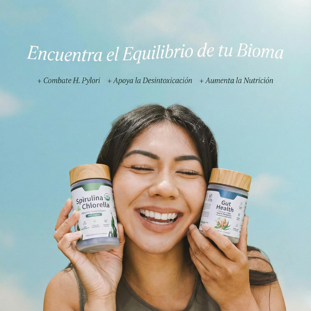 Toma 2 cápsulas al día de Gut Health y 4 al dia de Spirulina/Chlorella, preferiblemente con alimentos y un vaso de agua.